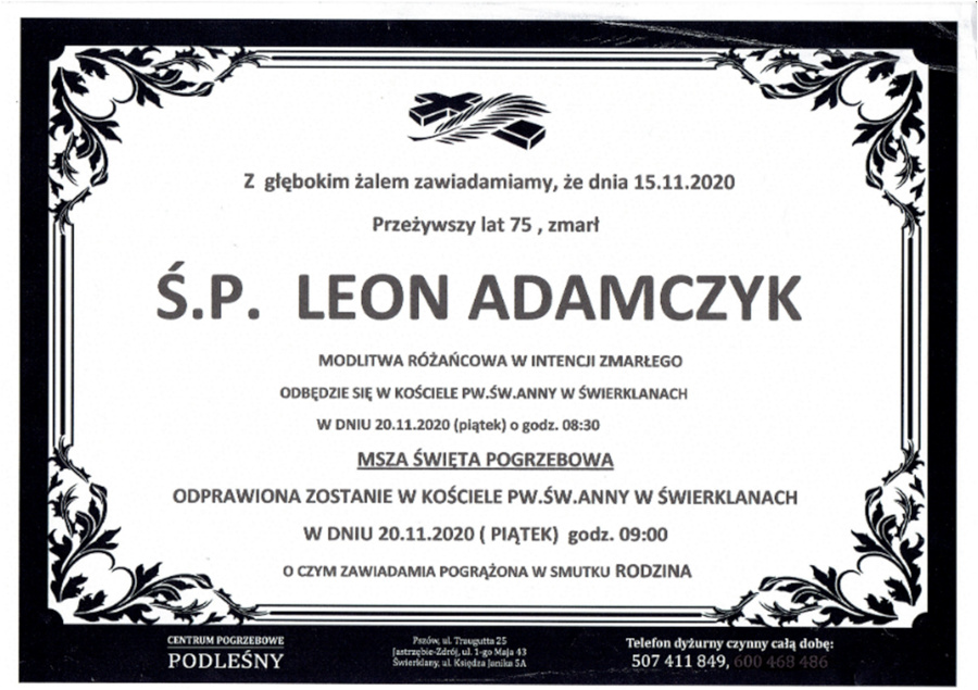 • 15.11.2020 - Śmierć Prezesa Leona Adamczyka – pogrzeb odbył się 20.11.2020