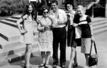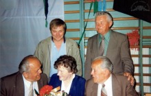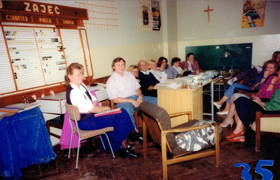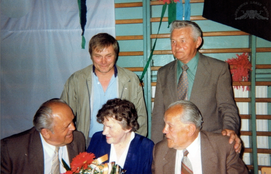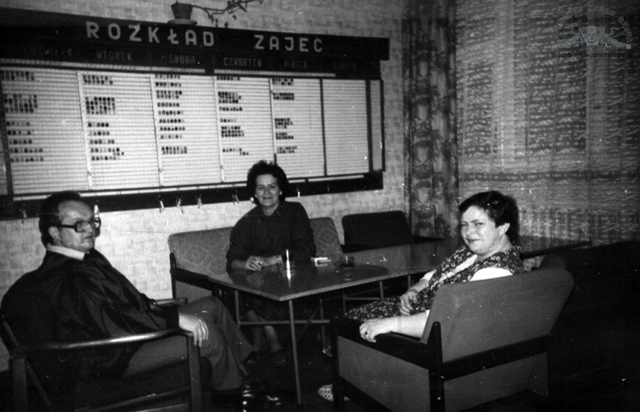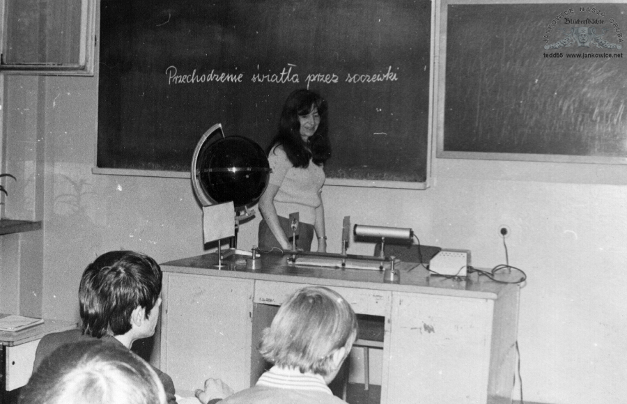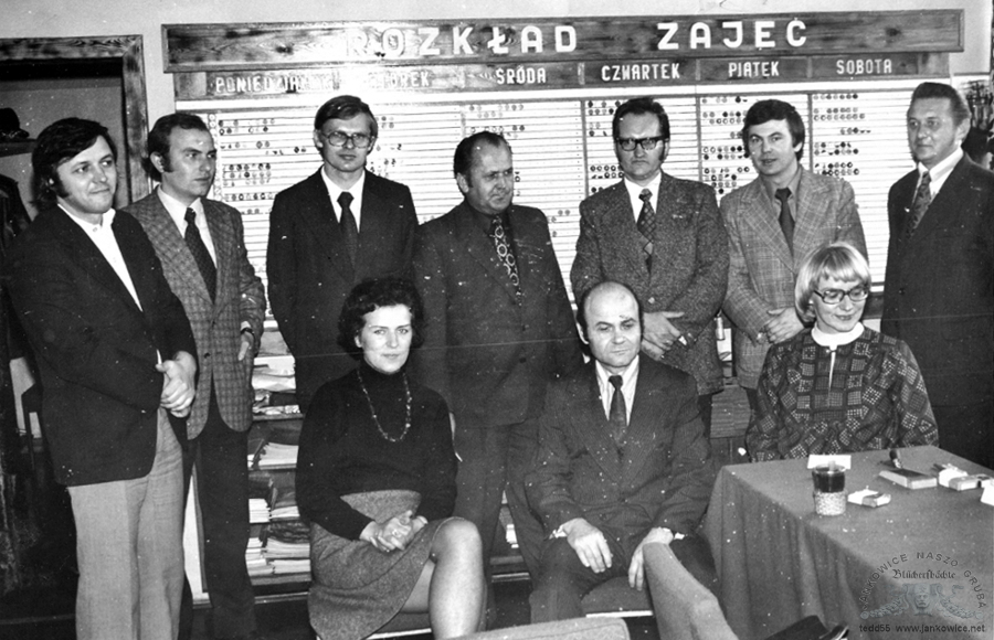 Grono nauczycielskie - 1974/75. Dolny rząd: były dyrektor Paweł Maciejończyk, Teresa Zając, Anna Swoboda, Kornelia Waszecka, ówczesny dyrektor Roman Wyleżuch, Małgorzata Jaszek-Jabłońska, Teresa Araszczuk, sekretarka Alicja Guzy.